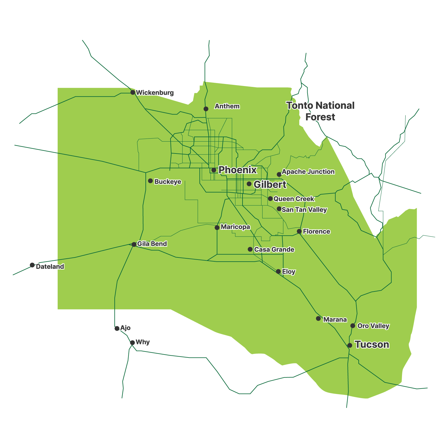 Explore nuestra área de servicio en el mapa; si se encuentra cerca o fuera de ella, póngase en contacto con nosotros para ver si podemos ayudarle. Ofrecemos presupuestos gratuitos y siempre estamos abiertos a ampliar nuestros límites de servicio para satisfacer sus necesidades.